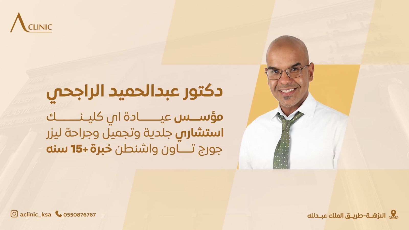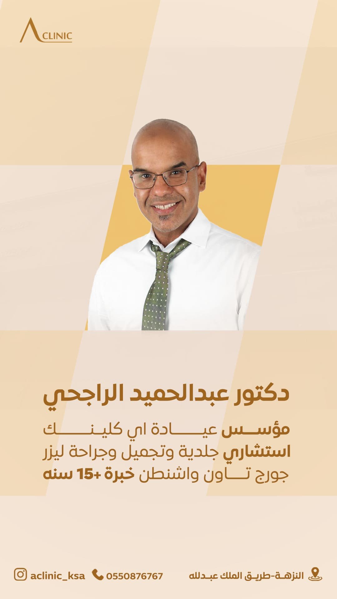بخبرة أكتر من 10 أعوام و أمهر أطباء التجميل في الرياض ، يتربع الآن الدكتور عبد الحميد الراجحي على عرش استشاري الجلدية، والتجميل، وجراحة الليزر، والتخصص في علاج الدوالي وتجميل الساقين,حاصل على البورد الأمريكي عام2013 والزمالة من جامعة جورج تاون بواشنطن. تلقى تدريبه في الجراحة العامة والتجميلية بجامعة كولومبيا في نيويورك، ويمتلك رخصة طبية في ولاية نيوهامبشر. عمل محاضرًا بجامعة دارتموث هيتشكوك وشارك في برامج علمية بجامعاتهارفارد وأخرى أمريكية. تلقى تدريبًا متقدمًا في نحت الوجه والجسم وعلاج أوردة الساقين بعدة مدنأمريكية. وهو عضو في العديد من الجمعيات الطبية الأمريكية وقدّم أبحاثًا علمية بمؤتمرات عالمية في الأمراض الجلدية.…..اعرف المزيد